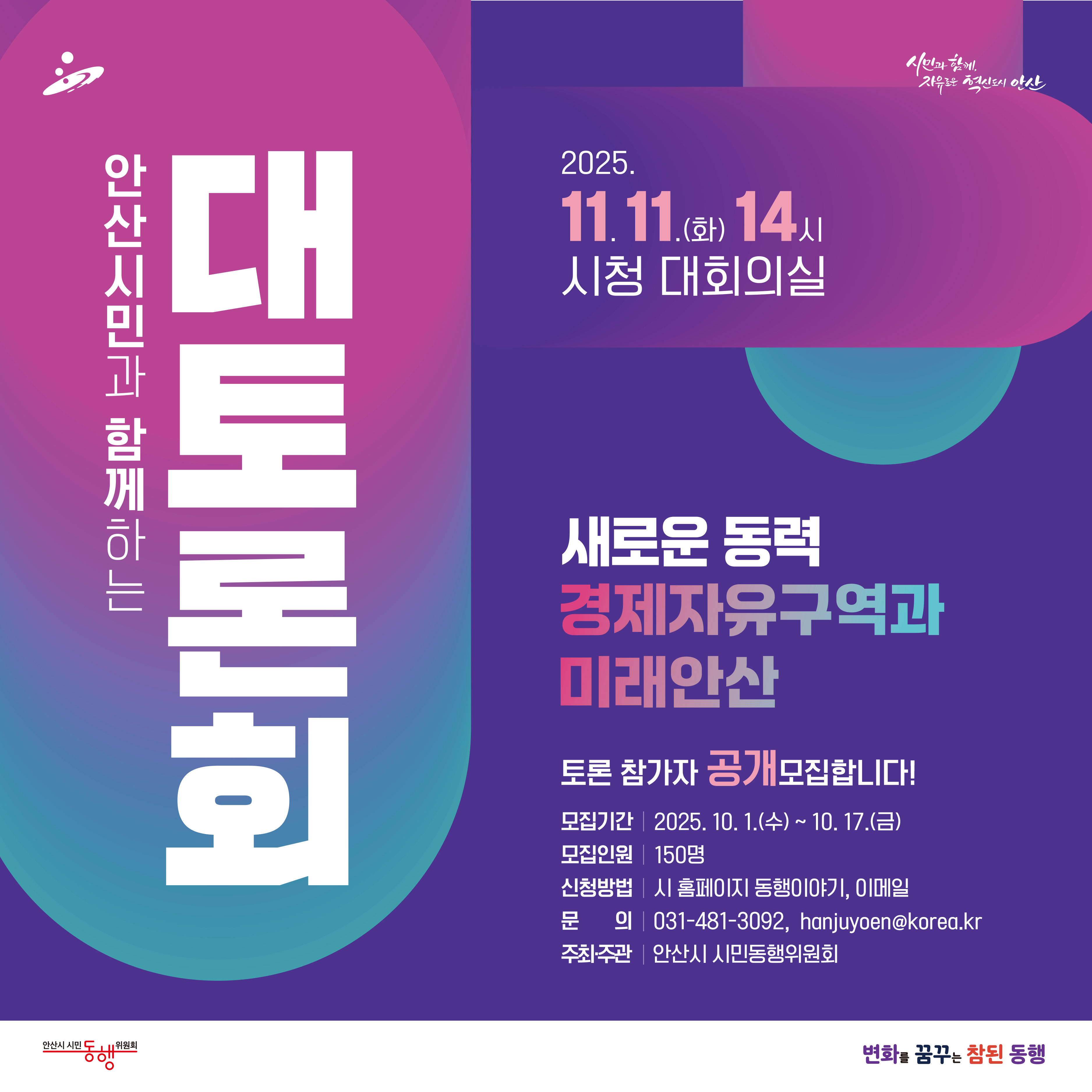 안산시민과 함께「경제자유구역 미래안산 안산경제의 새로운 동력」주제로 대토론회를 진행합니다.