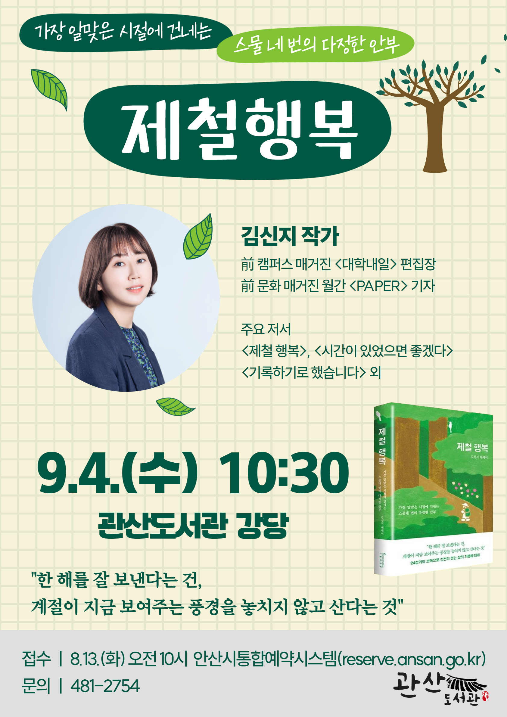 작성일 2024-09-02 조회수 374 새소식 상세보기 - 제목, 등록일, 등록부서, 내용, 첨부파일, 링크(URL) 제목 [관산도서관] 제철행복: 김신지 작가와의 만남 등록일 2024-09-02 등록부서 중앙도서관 내용 사진 확대보기 안산시통합예약시스템(reserve.ansan.go.kr)>예약신청>교육·강좌>기타>'제철행복' 검색 첨부파일 jpg 문서 홍보(안)_독서의달 강연.jpg 파일 다운로드 버튼 미리보기 링크(URL) 이전글 2024년 안산 디지털 전환 부스트업 지원 사업 공고 다음글 5060 신중년을 위한 '2024년 안산 역사 문화 탐방 프로그램' 참여자 모집 목록