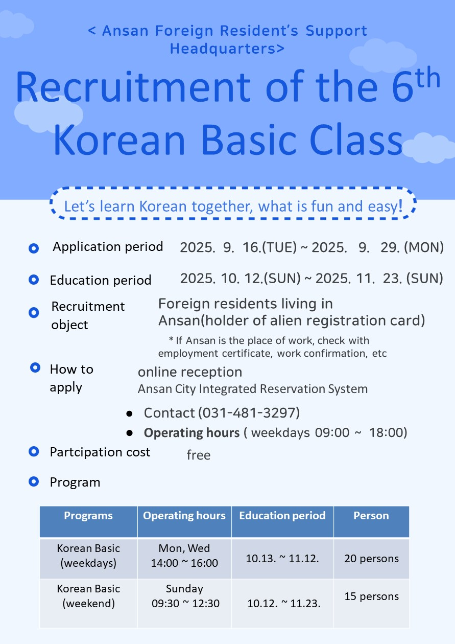 □ 신청방법 : 외국인주민지원본부 홈페이지 온라인접수 (https://www.ansan.go.kr/global) ※ 선착순 접수마감