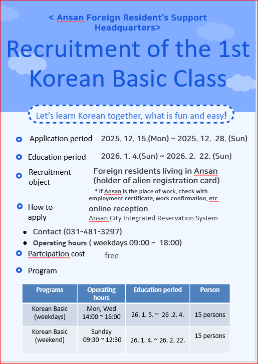 □ 신청방법 : 외국인주민지원본부 홈페이지 온라인접수 (https://www.ansan.go.kr/global) ※ 선착순 접수마감