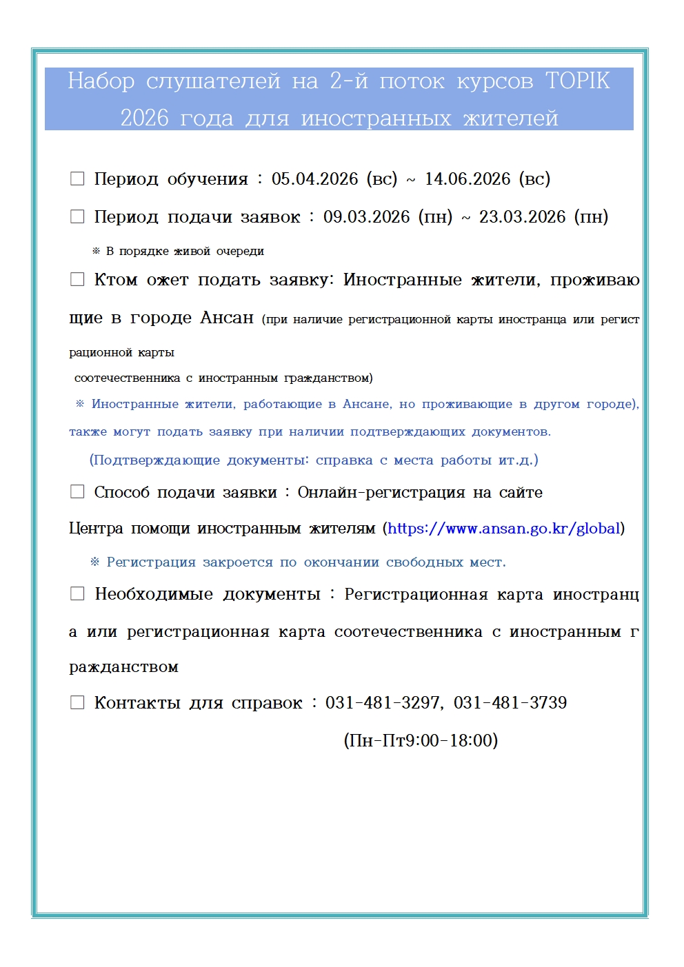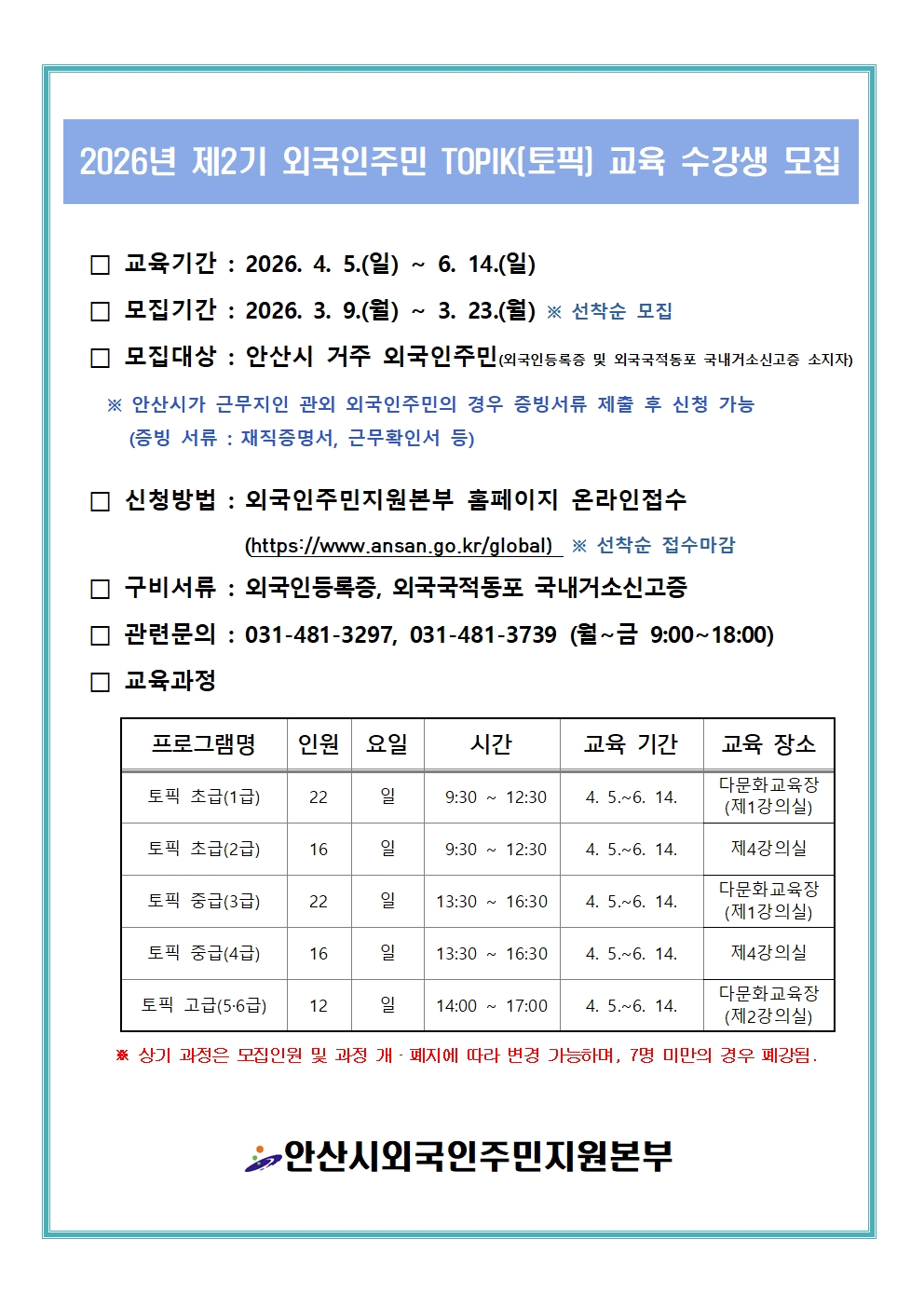 2026년 2기 외국인주민 토픽(TOPIK)대비반 교육 수강생 모집 등록부서 외국인주민지원본부 외국인주민지원과 등록일 2026-03-06 조회수 534 전시소개,홍보영상,주요 전시유물 를 보여주는 표 내용 첨부파일 pdf 문서 한국어◀ 2026년 제2기 외국인주민 TOPIK(토픽) 교육 수강생 모집.pdf 미리보기 pdf 문서 영어◀ 2026년 제2기 외국인주민 TOPIK(토픽) 교육 수강생 모집.pdf 미리보기 pdf 문서 중국어◀ 2026년 제2기 외국인주민 TOPIK(토픽) 교육 수강생 모집.pdf 미리보기 pdf 문서 베트남어◀ 2026년 제2기 외국인주민 TOPIK(토픽) 교육 수강생 모집.pdf 미리보기 pdf 문서 러시아어◀ 2026년 제2기 외국인주민 TOPIK(토픽) 교육 수강생 모집.pdf 미리보기 목록 이전글 2026 다문화신문 구독지원 운영신문사 모집 재공고 다음글 다음글이 없습니다.