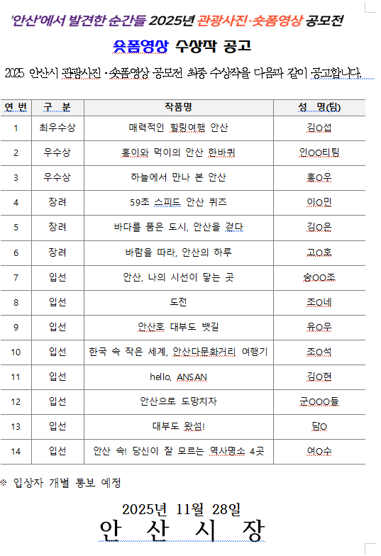 작성일 2025-11-28 조회수 200 공지사항 상세보기 - 제목, 등록부서, 등록일, 내용, 첨부파일 제목 2025년 안산시 관광사진·숏폼영상 공모전 최종 수상작 안내 등록부서 관광과 등록일 2025-11-28 내용 첨부파일 hwp 문서 2025년 안산시 관광사진숏폼영상 공모전 당선작 공고_.hwp 파일 다운로드 버튼 미리보기 이전글 광장의 밤, 빛으로 물들다 : 안산 겨울 빛의 나라 다음글 2025 안산시 관광사진·숏폼영상 공모전 수상작 전시회 목록