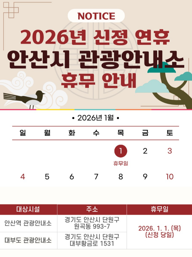 작성일 2025-12-29 조회수 123 공지사항 상세보기 - 제목, 등록부서, 등록일, 내용, 첨부파일 제목 2026 신정 당일(2026.1.1.) 안산시 관광안내소 휴뮤 안내 등록부서 관광과 등록일 2025-12-29 내용 신정을 맞아 안산역 관광안내소와 대부도 관광안내소가 하루간 쉬어갑니다. 여행일정에 참고 부탁드립니다.⠀ - 휴무일: 2026. 1. 1. (목) (신정 당일) ⠀ - 대상 시설 ⠀ 1. 안산역 관광안내소 (경기도 안산시 단원구 원곡동 993-7) 문의처: 070-4740-2580 ⠀ 2. 대부도 관광광안내소 (경기도 안산시 단원구 대부황금로 1531) 문의처: 1899-1720 첨부파일 이전글 대부도에서 맞이하는 일출·일몰 여행 다음글 [2026 성호박물관 절기행사] 입춘첩 나눔 목록