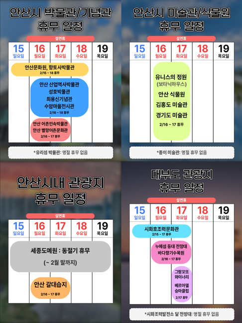 작성일 2026-02-10 조회수 4 공지사항 상세보기 - 제목, 등록부서, 등록일, 내용, 첨부파일 제목 2026 설 연휴, 안산시 주요 관광지 휴무 안내 등록부서 관광과 등록일 2026-02-10 내용 2026 설 연휴, 안산시 주요 관광지 휴무 안내 설 연휴기간, 안산시 주요 관광지 휴무일정 안내드립니다 여행의 설렘과 즐거움처럼, 올 한 해도 좋은 에너지 가득하시길 바랍니다. 새해 복 많이 받으세요! 첨부파일 이전글 2026년 수암마을전시관 2관 대관 신청 공고 안내 다음글 다음글이 없습니다. 목록