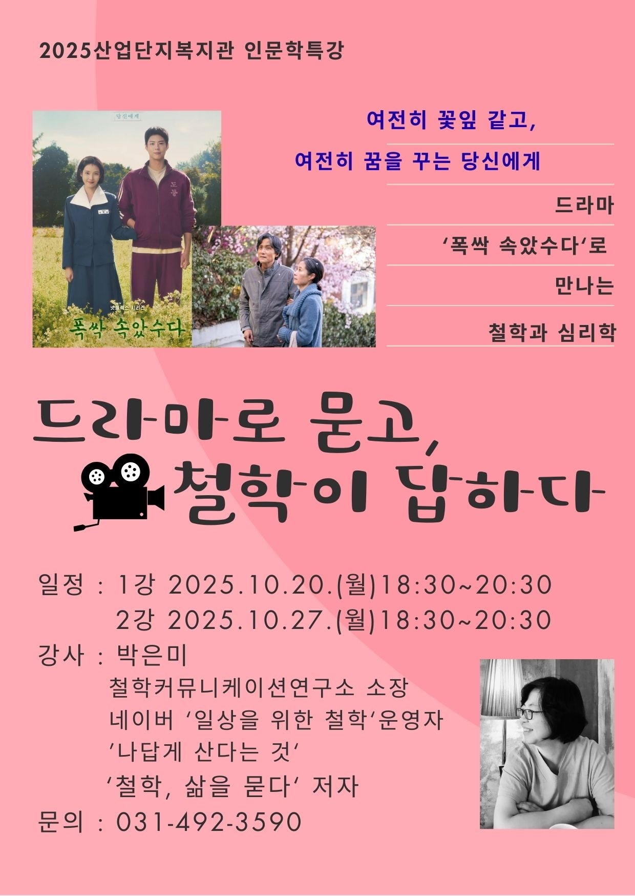 작성일 2025-10-01 조회수 530 새소식 상세보기 - 제목, 등록일, 등록부서, 내용, 첨부파일, 링크(URL) 제목 안산시 산업단지복지관 인문학특강「드라마“폭싹 속았수다”로 철학하기」 등록일 2025-10-01 등록부서 노동일자리과 내용 사진 확대보기 안산시 산업단지복지관 인문학특강 「드라마 “폭싹 속았수다” 로 철학하기」 ○ 일시 : 2025.10.20.(월) 18:30~20:30 / 10.27.(월) 18:30~20:30 ○ 강사 : 박은미(철학박사) ○ 접수 문의 : 031-492-3590 안산시산업단지복지관 첨부파일 jpg 문서 안산시산업단지복지관 인문학특강_드라마“폭싹 속았수다”로 철학하기.jpg 파일 다운로드 버튼 미리보기 링크(URL) 이전글 「안산시민과 함께하는 대토론회」 참가희망자를 모집합니다! 다음글 안산시다문화가족지원센터 채용 공고(러시아 통역사) 목록