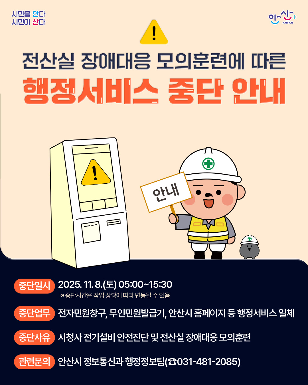 작성일 2025-11-03 조회수 89 새소식 상세보기 - 제목, 등록일, 등록부서, 내용, 첨부파일 제목 2025년 전산실 장애대응 모의훈련 실시에 따른 행정서비스 중단 안내 등록일 2025-11-03 등록부서 정보통신과 내용 사진 확대보기 ○ 중단일시 : 2025. 11. 8.(토) 05:00~15:30 ※ 중단시간은 작업 상황에 따라 변동될 수 있음 ○ 중단업무 : 전자민원창구, 무인민원발급기, 안산시 홈페이지 등 행정서비스 일체 ○ 중단사유 : 시청사 전기설비 안전진단 및 전산실 장애대응 모의훈련 ○ 관련문의 : 안산시 정보통신과 행정정보팀(☎031-481-2085) 첨부파일 jpg 문서 01.jpg 파일 다운로드 버튼 미리보기 목록 이전글 안산시 주요품목 물가현황(2025.11.3. 기준) 다음글 2025년 안산정보산업진흥센터(경기TP안산창업보육센터) 제4차 신규 입주자 모집 공고