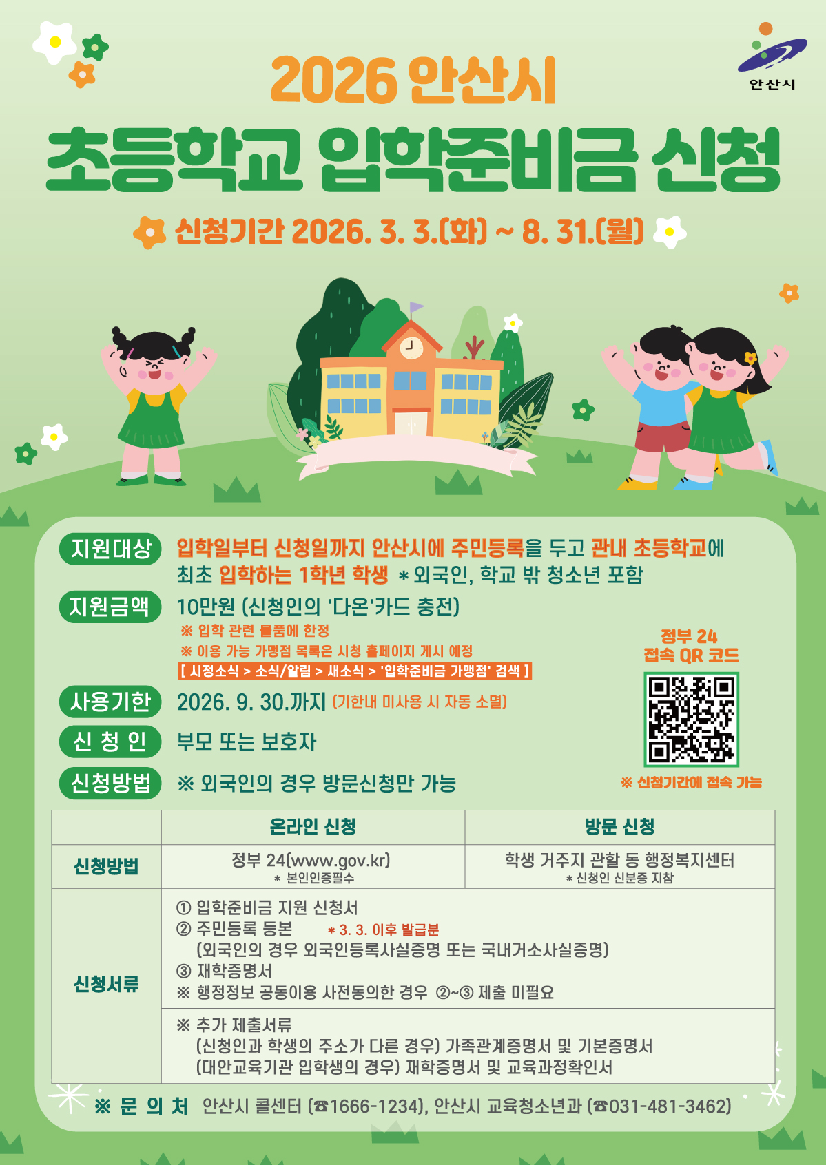 □ 지원대상 : 입학일부터 신청일까지 안산시에 주민등록(외국인의 경우 체류지 등록)이 되어 있는 관내 초등학교 1학년 입학생