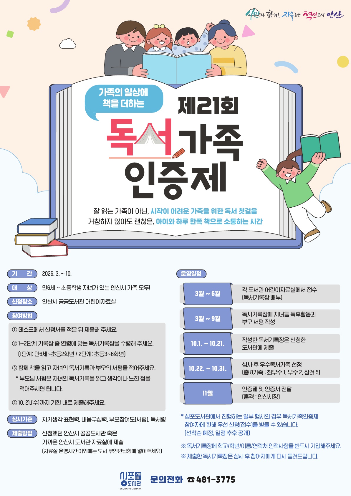 작성일 2026-03-16 조회수 450 새소식 상세보기 - 제목, 등록일, 등록부서, 내용, 첨부파일, 링크(URL) 제목 [성포도서관] 가족의 일상에 책을 더하는 제21회 독서가족인증제 안내 등록일 2026-03-16 등록부서 감골도서관 내용 사진 확대보기 오늘 하루 아이와 몇 분 대화를 나누셨나요? 책으로 우리 아이와 대화를 나누고, 가족간의 유대감을 키우는 시간을 마련해보는건 어떨까요? 만 6세~초등학생 자녀가 있는 안산시 가족이라면 누구나 참여 가능합니다. 가까운 안산시 공공도서관 어린이자료실에서 신청하고 독서기록장을 받아가세요.^^ ○ 문의 : 성포도서관 481-3775 첨부파일 jpg 문서 성포도서관 제21회 독서가족인증제 홍보(안).jpg 파일 다운로드 버튼 미리보기 링크(URL) https://lib.ansan.go.kr/seongpo/NoticeInfoDetail/50731 이전글 안산시 주요품목 물가현황(2026.3.19. 기준) 다음글 ★고농도 초미세먼지 비상저감조치(2026.3.17.) 발령 ★ 목록