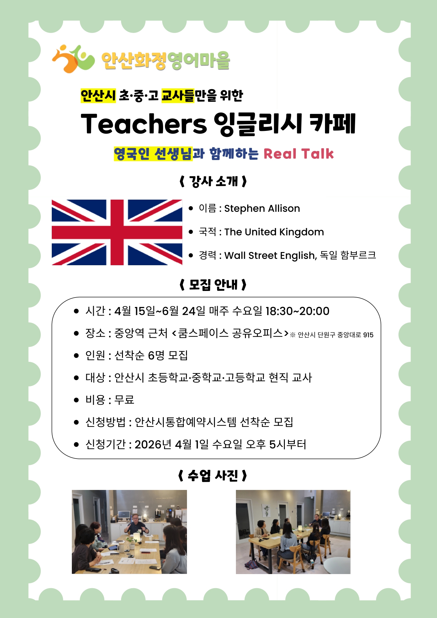 ‘Teachers 잉글리시 카페’는 영어 회화에 관심이 있는 안산시 초ㆍ중ㆍ고등학교 선생님들을 대상으로 영어 말하기 환경을 조성하고, 학습 네트워크 형성을 지원하는 프로그램이다. 지난해 하반기 운영 결과 높은 만족도를 보이며 올해도 진행하게 됐다.