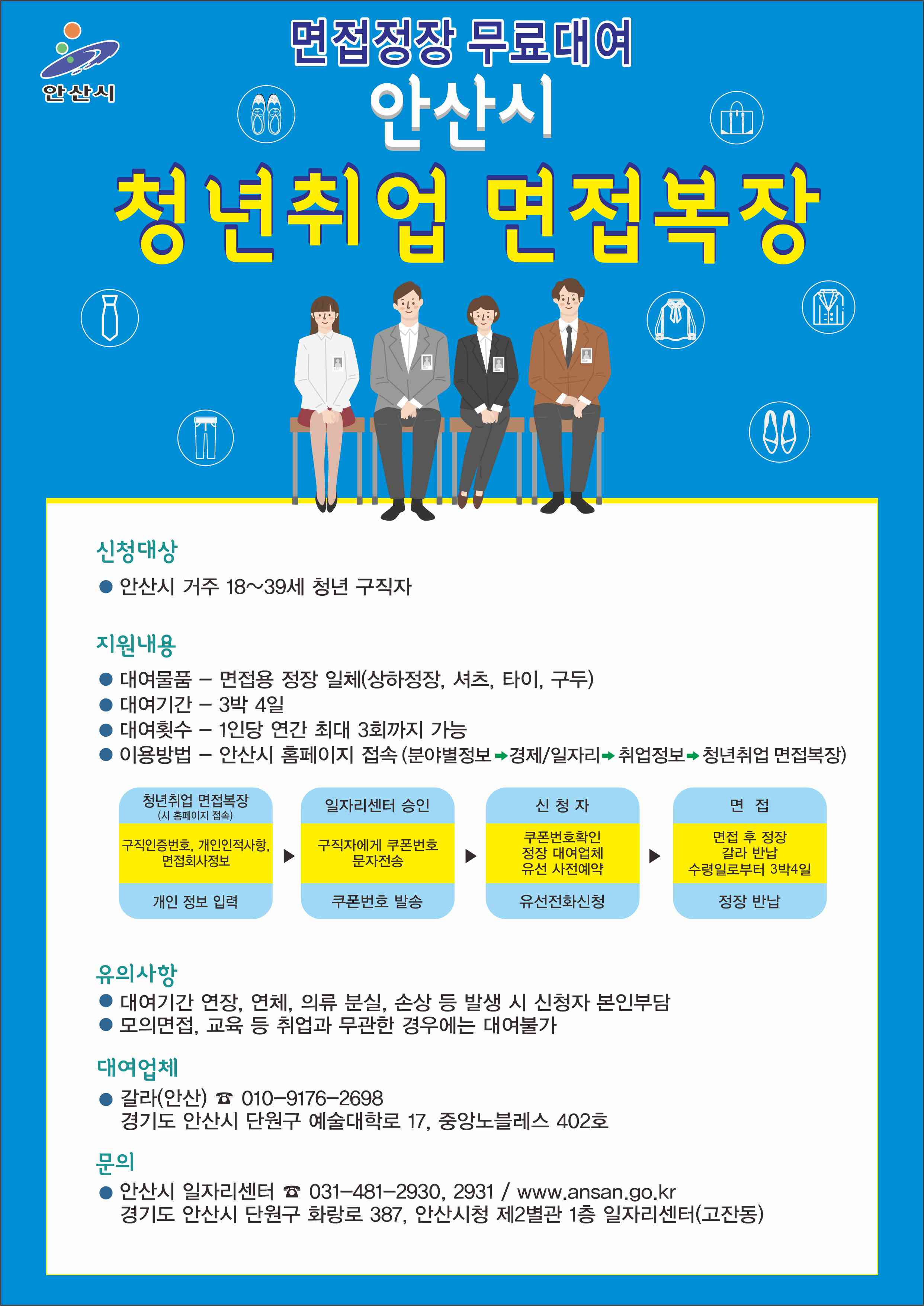 - 신청방법 : 안산시 홈페이지(분야별정보>경제/일자리>취업정보>청년취업 면접복장)